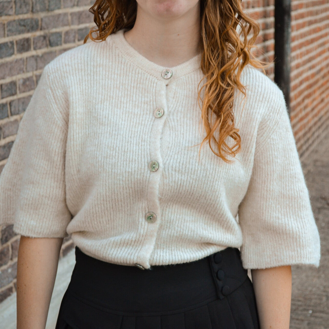 Heerlijk truitje met knoopjes en een korte mouw. Fijn door te dragen richting het najaar, ook als vestje te dragen.